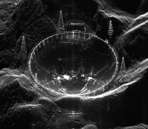 首次成功获取FAST (500米口径球面射电望远镜)全方位三维雷达图像,三维分辨率为0.3m×0.3m×0.3m(距离×方位×高程)。FAST三维立体结构清晰可见,红圈内为悬挂于球面反射面之上的馈源。馈源支撑塔高度测量值约为168 m,与实际情况相符。