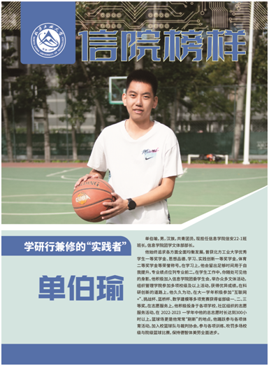 单伯瑜,男,汉族,共青团员,现担任信息学院信安22-1班班长,信息学院团学文体部部长。