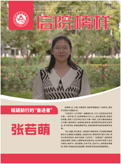 张若萌,女,汉族,共青团员,信息学院通信21-1班学生,曾任艺术团办公室副主任。
