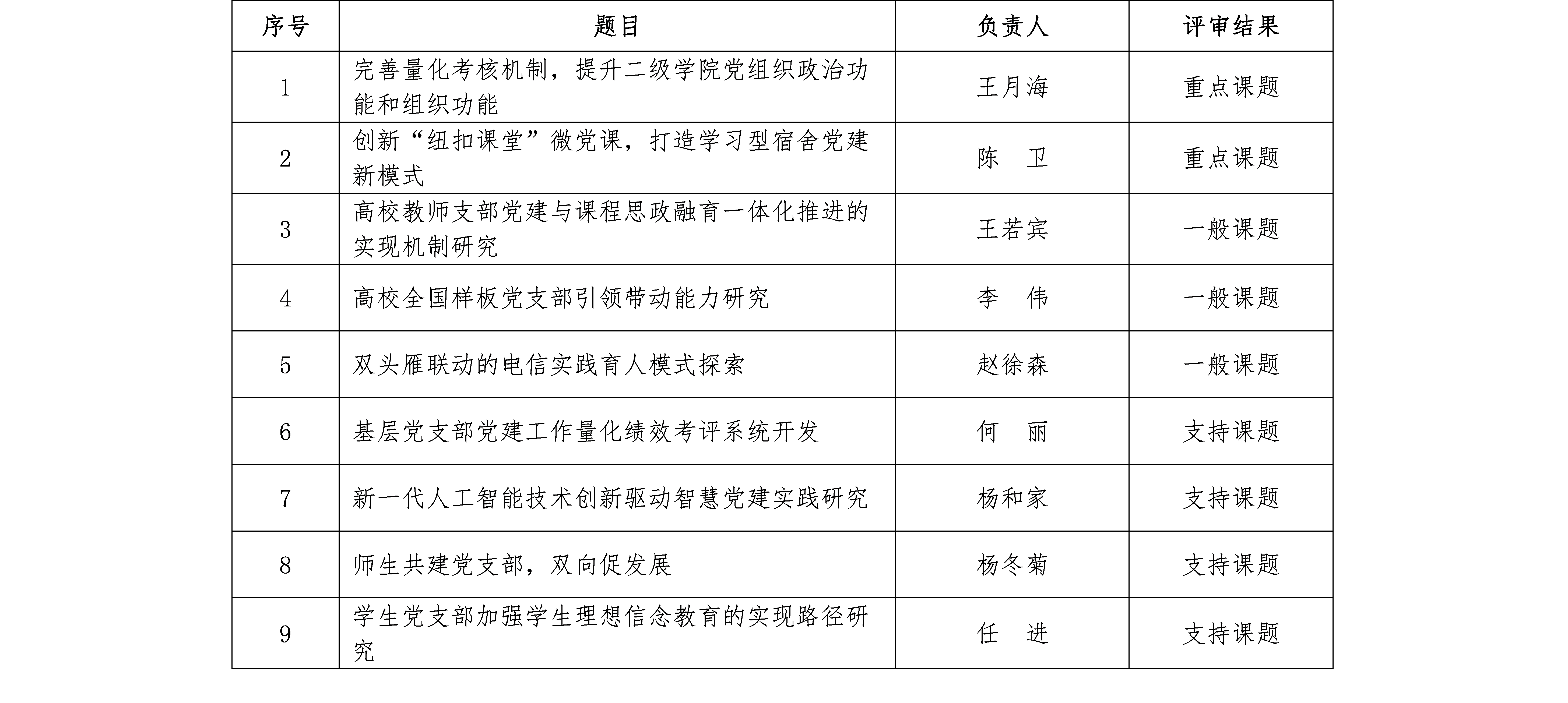 根据组织部《关于申报2023年度党建研究课题的通知》要求,经个人申报、二级单位党组织审核推荐、校内专家评审,评出校内重点课题5项,一般课题9项,支持课题19项。beat365官网重点课题2项,一般课题3项,支持课题4项,共9项党建研究课题立项(详见附件1),课题研究期限为1年。