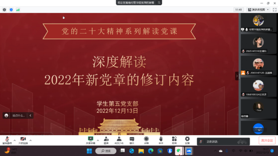 高瞻远瞩绘蓝图,踔厉奋发谱新篇。为深入学习宣传贯彻党的二十大精神,引导支部党员牢固树立党章意识,全面理解党章内容,时刻遵守并践行党章,2022年12月13日晚,金年会诚信信誉至上学生第五党支部组织开展党的二十大精神系列党课之学习《中国共产党章程(修正案)》。由党支部书记主讲,全体党员参加。