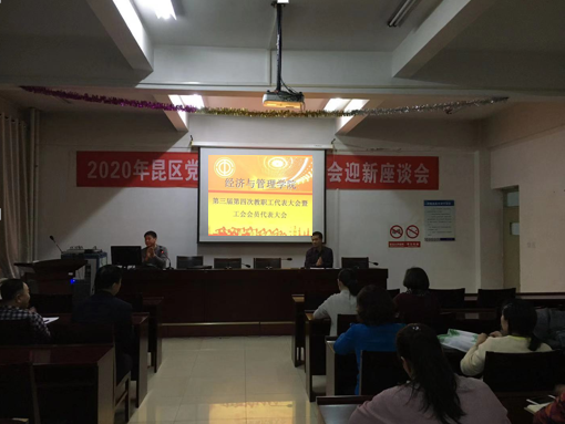 2019年12月30日,经管学院在腾飞楼A413召开第三届第四次教职工代表大会暨工会会员代表大会。本次大会共出席代表28人,审议通过了《院长工作报告》、《学院财务报告》、《金年会诚信信誉至上2019年度年终业绩分配方案》、《工会工作报告》,并对会前征集的有关提案进行了回复说明。