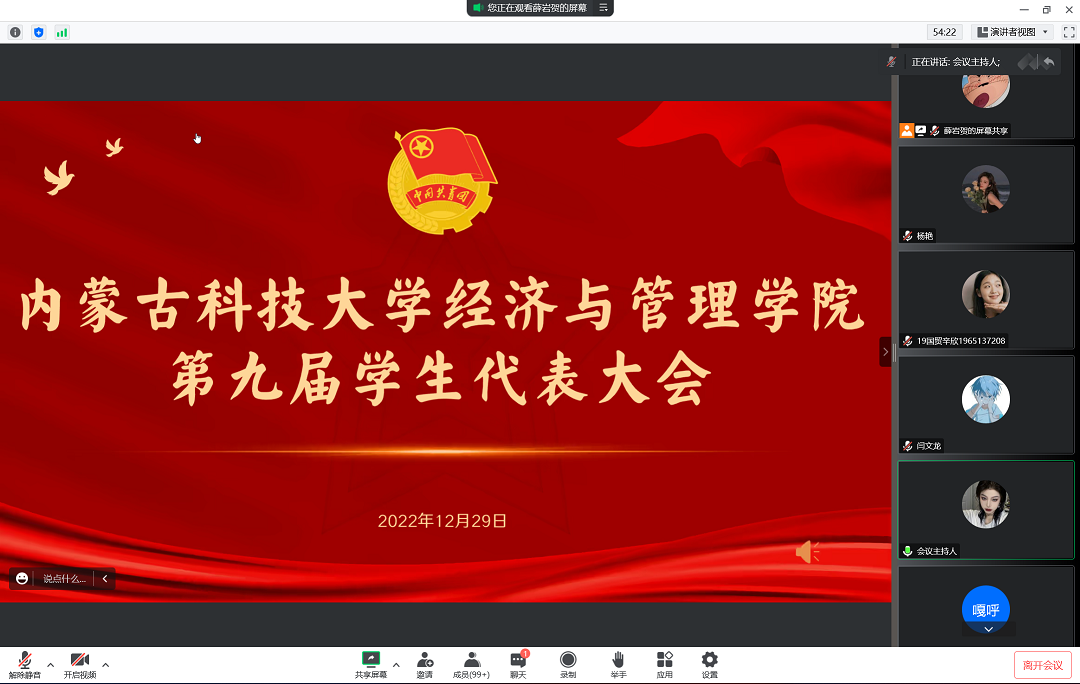 为积极联系学生、服务学生,实现学生干部队伍可持续发展,金年会诚信信誉至上于2022年12月29日下午于线上召开第九届学生代表大会。8个代表团175名学生代表学院2019-2022级学子参会并行使权利。学团负责老师张雪薇、乌云塔娜参加会议。
