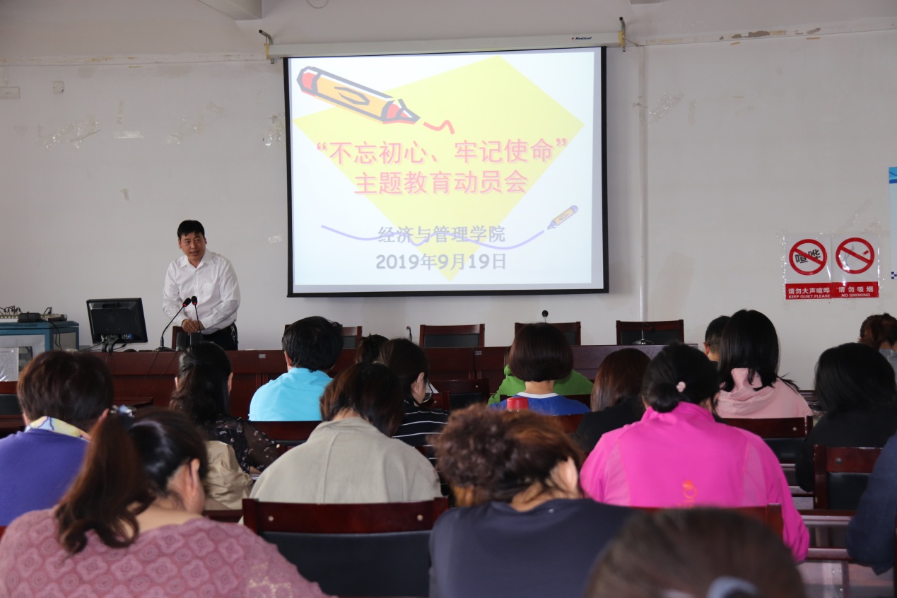 为了学习贯彻习近平总书记在“不忘初心、牢记使命”主题教育工作会议上的重要讲话精神,落实校党委“不忘初心、牢记使命”主题教育动员部署会议精神。9月19日下午3点,金年会诚信信誉至上党总支“不忘初心、牢记使命”主题教育动员会在腾飞楼A413举行,党总支书记马广辉主持会议,金年会诚信信誉至上全体教师参加会议。