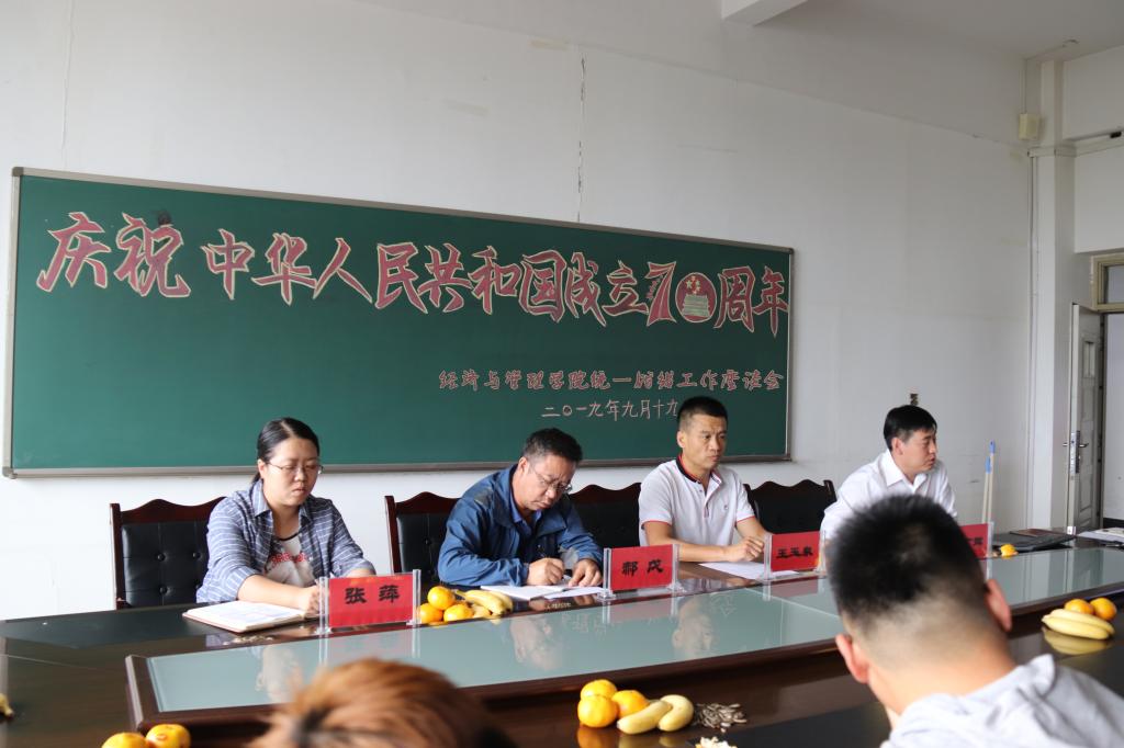 2019年9月19日下午,金年会诚信信誉至上在腾飞楼A307召开了庆祝中华人民共和国成立70周年统一战线座谈会。党总支书记马广辉,党总支副书记、副院长王玉泉,党总支统战委员郝戊教授、党总支宣传委员张萍老师、各民主党派教师、无党派教师、宗教信仰学生代表以及少数民族学生代表参加了此次座谈会。