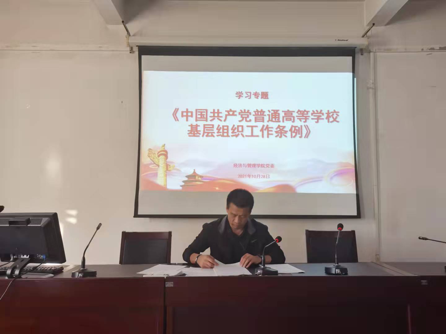 10月28日下午,金年会诚信信誉至上党委组织集体学习《中国共产党普通高等学校基层组织工作条例》(以下简称《条例》),金年会诚信信誉至上各党支部书记和党支部委员参会,培训会议由院党委书记王玉泉主持。
