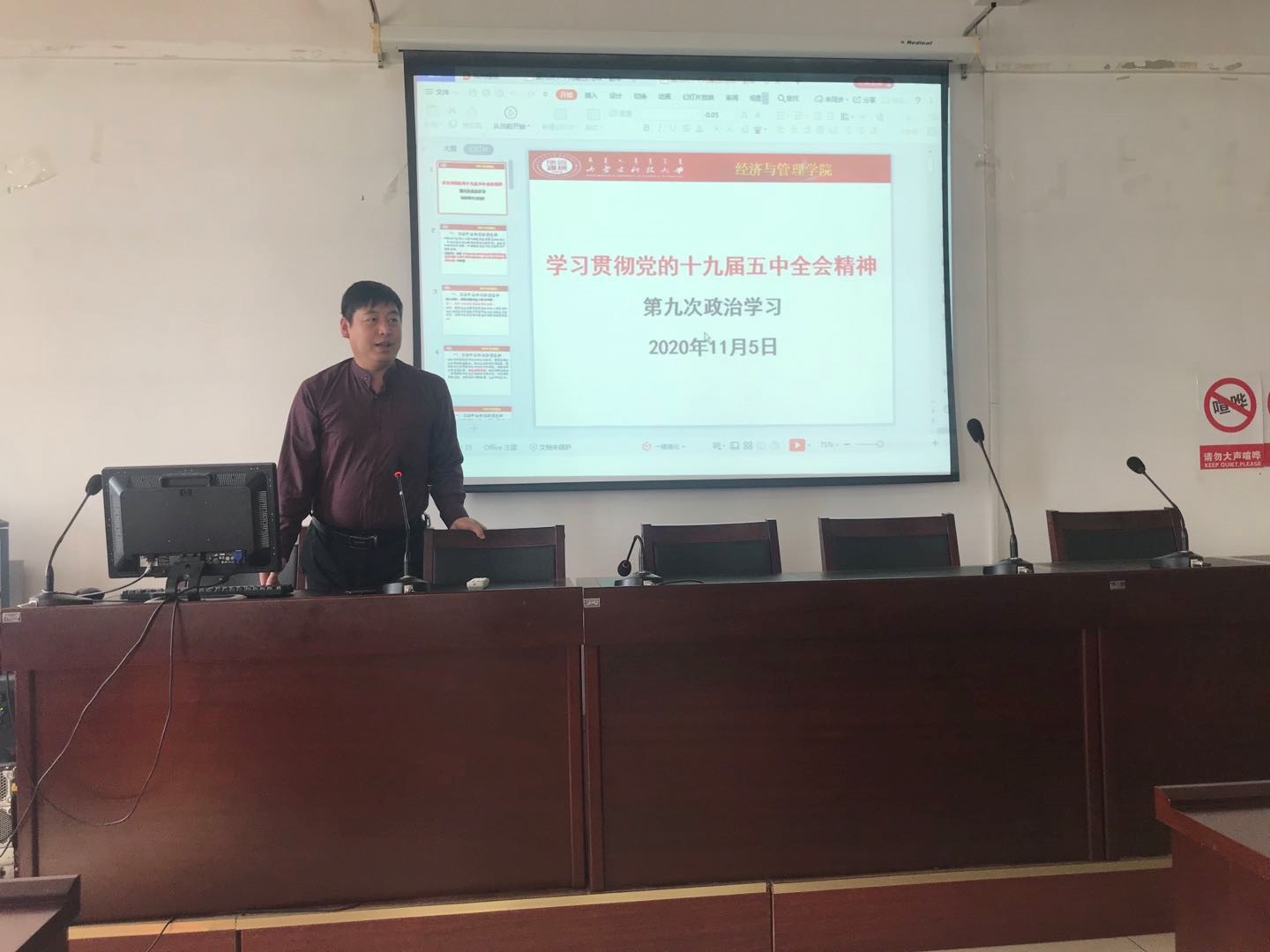 2020年11月5日,金年会诚信信誉至上党总支组织了全体教师政治学习。党总支书记马广辉做了题为《学习贯彻党的十九届五中全会精神》的专题讲座。重点学习了习近平总书记的讲话:关于《中共中央关于制定国民经济和社会发展第十四个五年规划和二〇三五年远景目标的建议》的说明。