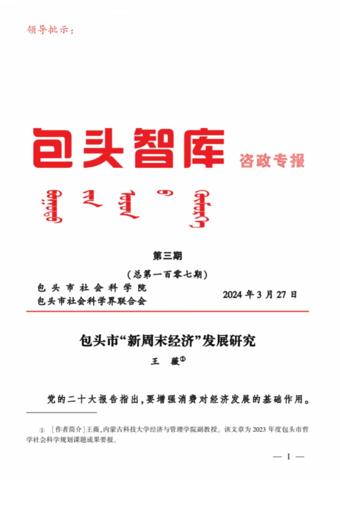 在坚持为党献策思想的引领下,金年会持续加大科研咨政工作力度。近日,王薇老师撰写的咨政报告《包头市“新周末经济”发展研究》刊登于《包头智库 咨政专报》2024年第三期,并获得包头市委副书记、市长张锐同志的肯定性批示。
