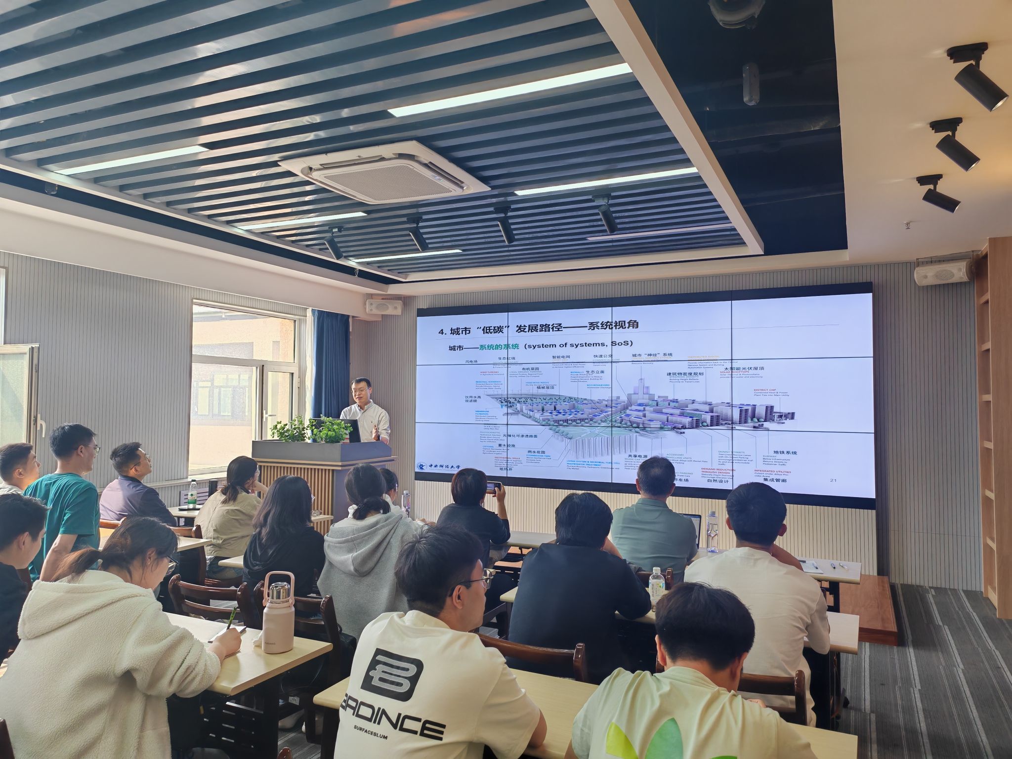 在主题报告中,从全球气候变化背景切入,系统分析了我国城市碳中和面临的挑战与机遇。他结合国内外典型案例,深入剖析了能源结构转型、低碳技术创新、碳市场机制设计等关键路径,提出多维协同治理模式。此外,他还分享了其团队在该领域的最新研究成果,为城市低碳转型提供了理论参考和实践启示。参会研究生纷纷表示,此次讲座拓宽了学术视野,对碳中和领域的研究方向有了更清晰的认识。