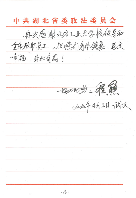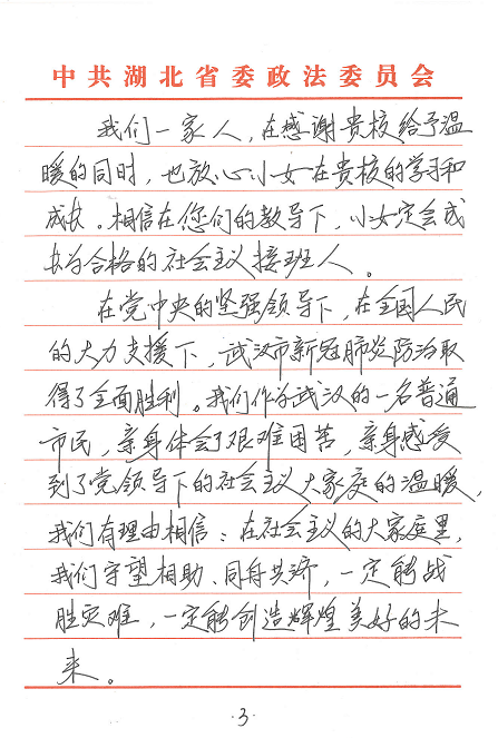 “小女程煜洋是贵校大二学生。我们一家生活在湖北省武汉市。我和我的夫人,想通过这封信,对您们表达真诚的感谢和崇高的敬意。在2020年史无前例的新冠肺炎抗疫期间,程煜洋陆续收到了贵校的慰问金、口罩、通信费等现金和物资,让我们身处抗疫中心的一家人倍感温暖,深切感到校方的关爱和情义……”。这是4月3日信息学院辅导员杨和家收到的一封来自通信18-3班程煜洋同学家长的感谢信,全文600余字,饱含了身处武汉抗疫中心的一家人对学校学院在疫情期间给予关心关爱的深切感激之情。