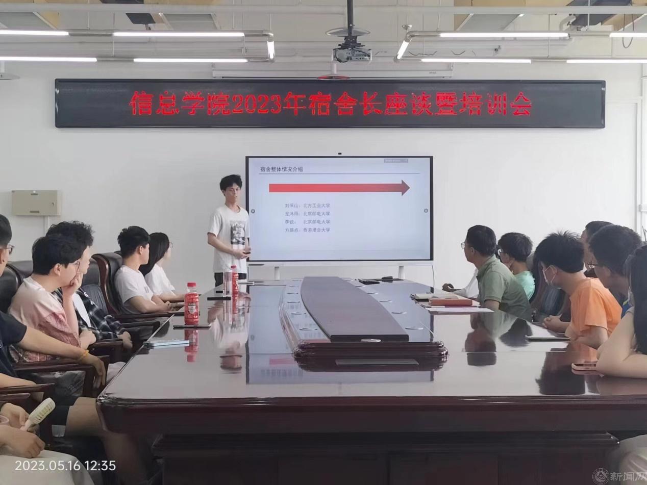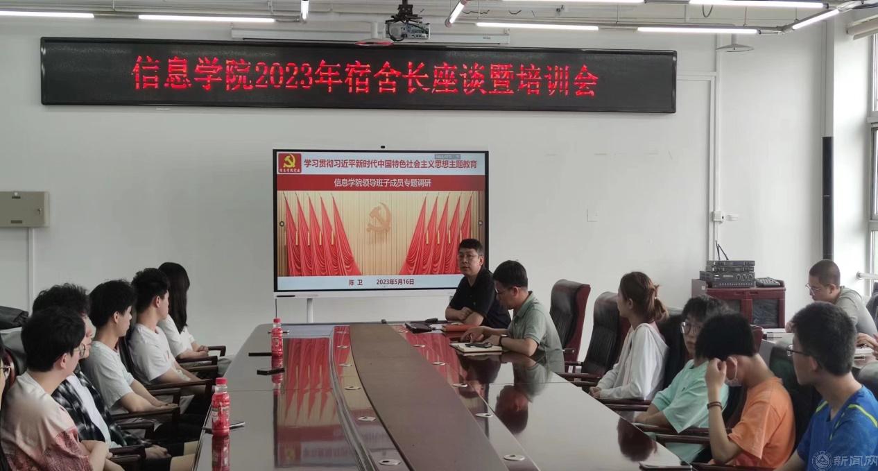 大学生宿舍思政教育已成为高校思想政治教育的重要组成部分,为了进一步推进信息学院“寓见一线”宿舍思政育人模式,加强和改进学院学生思想政治教育工作,5月16日中午,信息学院召开2023年宿舍长座谈暨培训会,学院党委副书记陈卫、团委书记杨和家、各年级辅导员和各年级宿舍长参会。