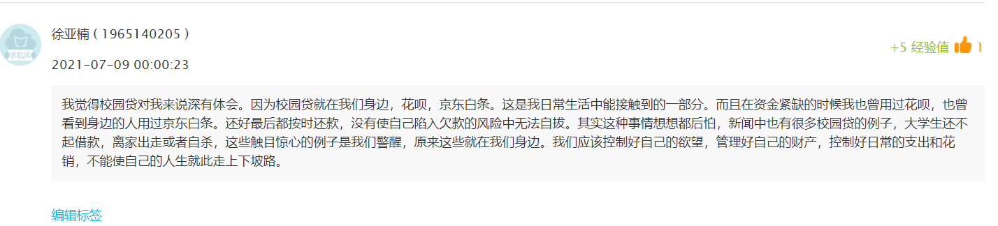 本课程在课程结束时,要求学生对课程中给涉及到的几个课程思政点的讨论进行感悟分享。通过学生在线上留言的反馈,大部分学生对校园贷的案例有很深的印象,通过资料查询和计算了解到校园贷的危害,起到了课程设计想要达到的知识、能力、素质目标。