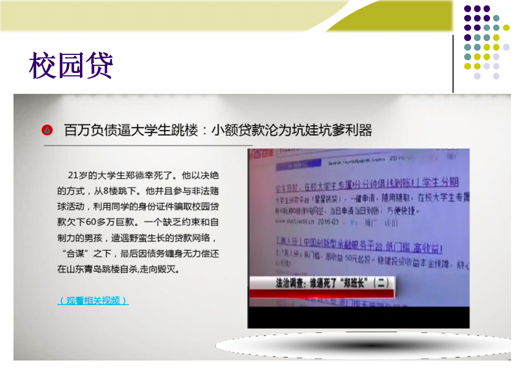 5.案例的基本情况:近些年“校园贷”问题频频出现在媒体曝光当中,引起了全社会的广泛关注。2016年4月,教育部与银监会联合发布了《关于加强校园不良网络借贷风险防范和教育引导工作的通知》,明确要求各高校建立校园不良网络借贷日常监测机制和实时预警机制,同时,建立校园不良网络借贷应对处置机制。2016年8月,银监会亦明确提出“停、移、整、教、引”五字方针,整改校园贷。2017年9月,教育部发布明确“取缔校园贷业务”,任何网络贷款机构都不允许向在校大学生发放贷款。即便如此,校园贷问题在过去的几年中屡禁不止,成为损害学生身心健康及所在家庭利益的刽子手。